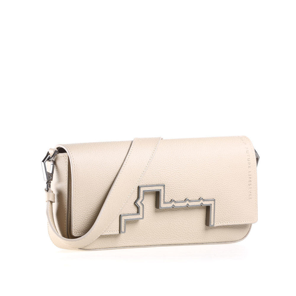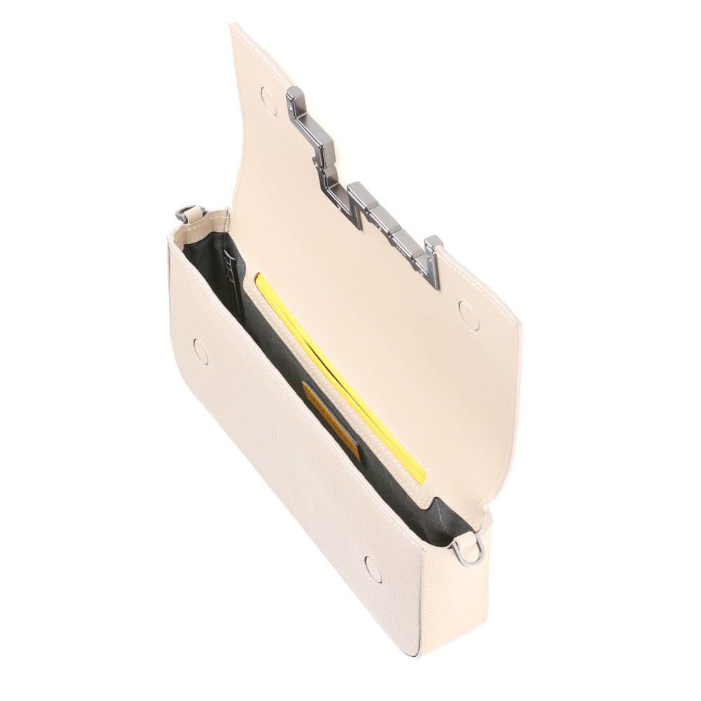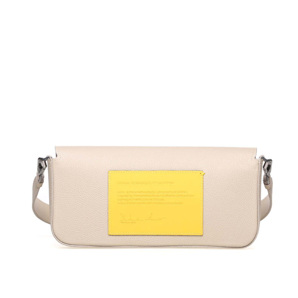 این کیف با طراحی مینیمال گزینهای ایدهآل برای استفاده روزمره و محیطهای رسمی است. بند کوتاه آن بهگونهای طراحی شده که بهراحتی زیر بازو قرار میگیرد یا بهصورت دستی حمل میشود و حس زنانگی را به مخاطب القا کند. لوگوی برجسته "مشق دال" که در جلوی کیف دیده میشود، هویت و امضای بصری این محصول را به زیبایی به نمایش میگذارد. جیب روی بدنه با نوشته ی روی آن ترکیبی جسورانه و مدرن است که در کنار لوگو، جسارت و تمایز طراحی را دوچندان میکند و هویت برند را بهشکلی خلاقانه و مدرن تقویت مینماید.. طراحی ظریف و المانهای خاص این کیف، آن را به یک انتخاب منحصر به فرد تبدیل کرده است.